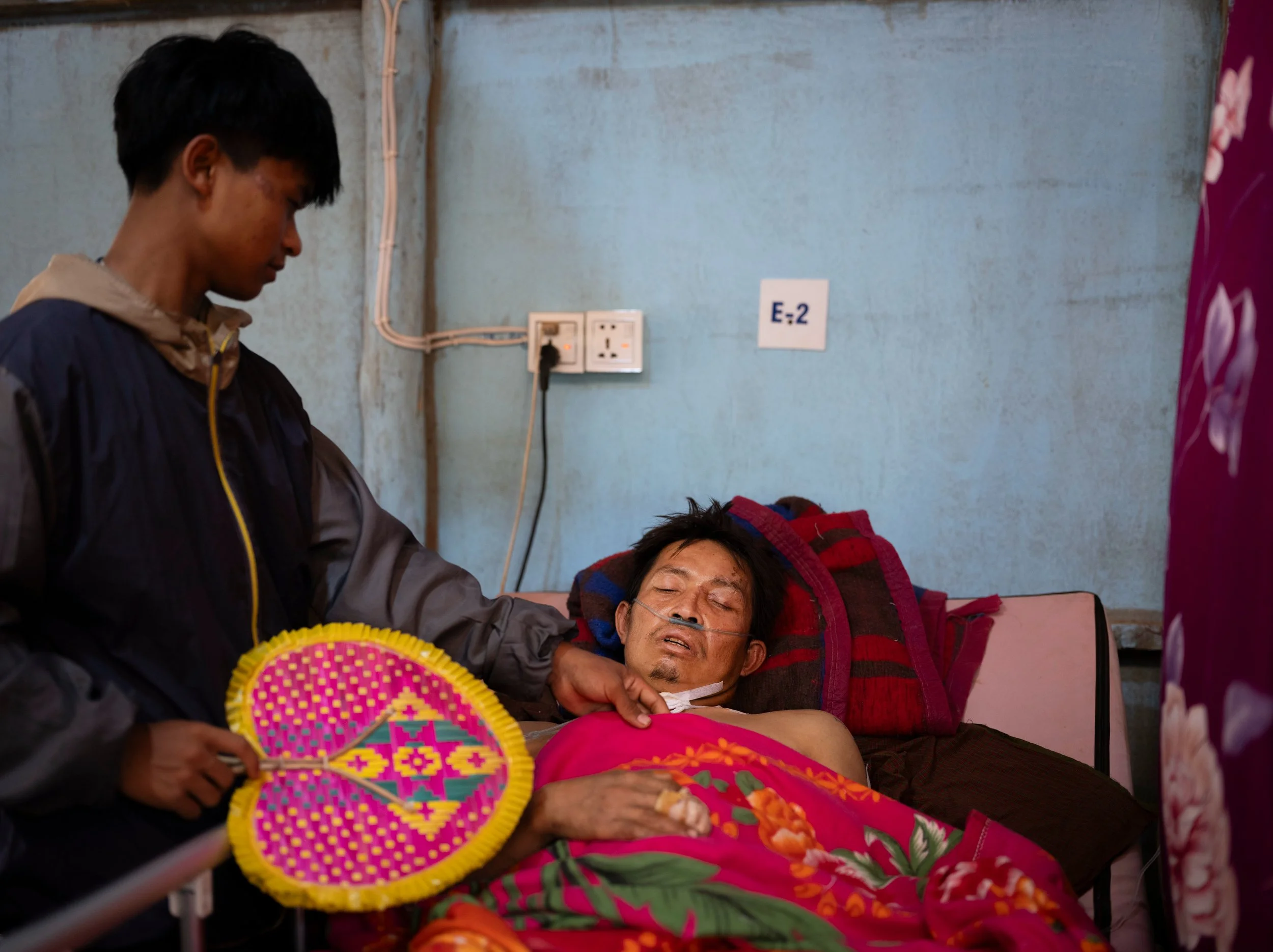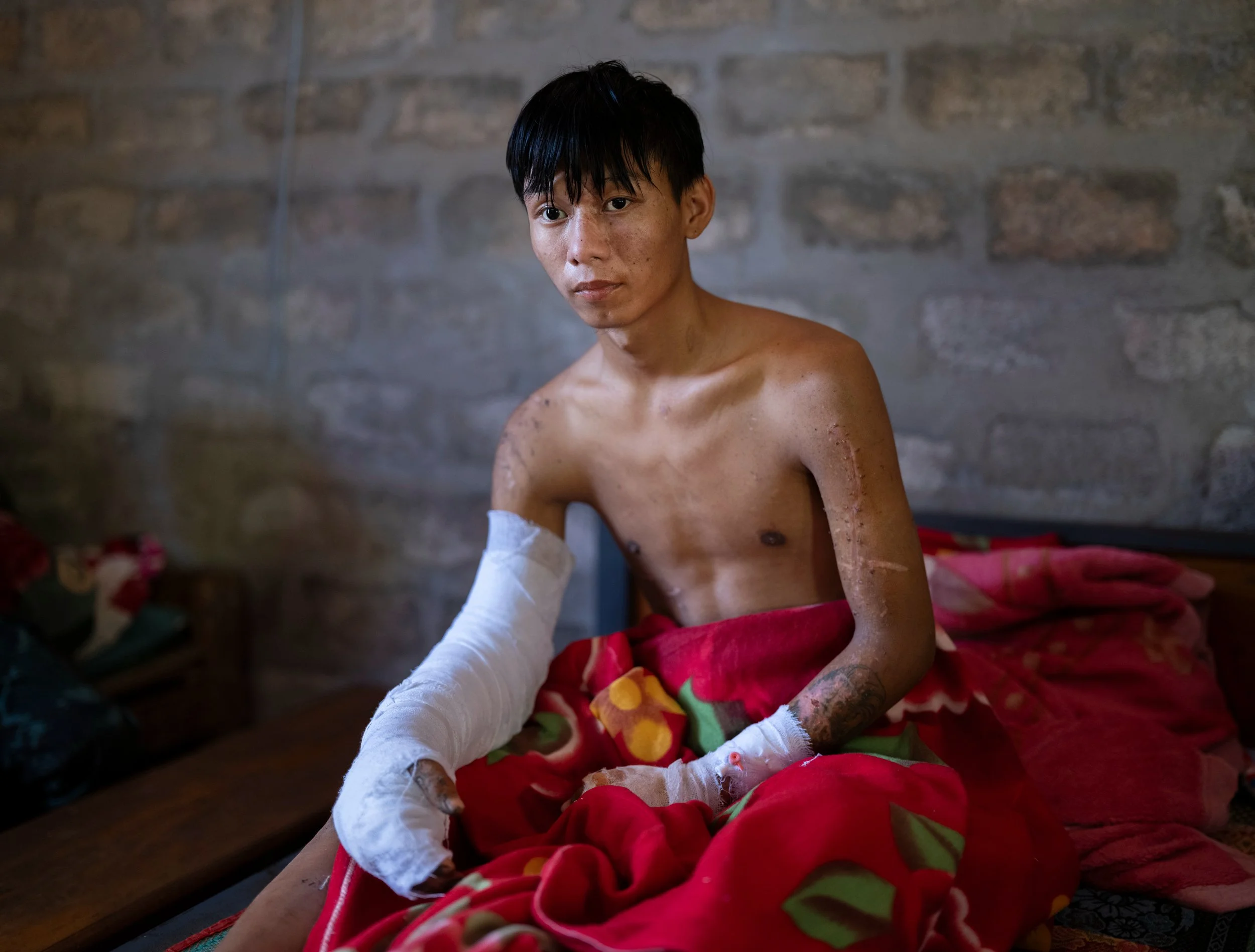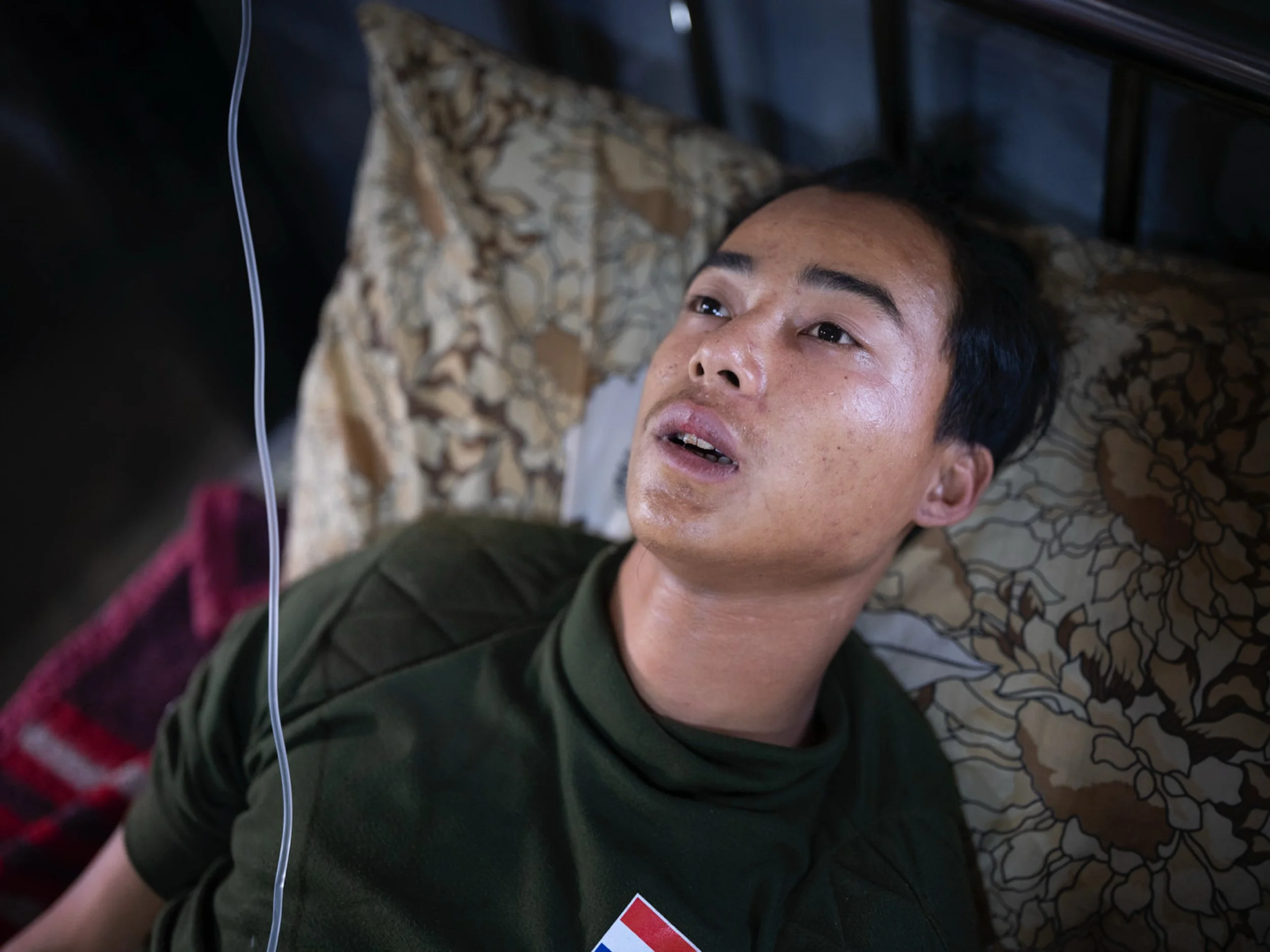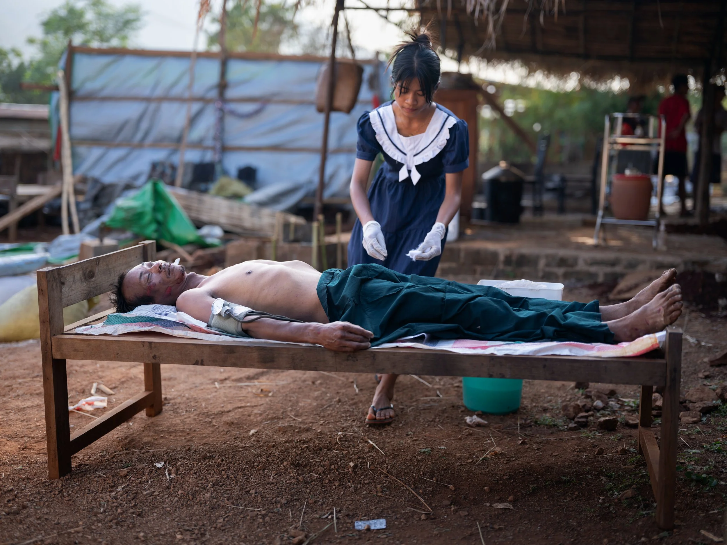 Wounded by a landmine, a KNDF fighter lies in agony awaiting amputation. Myanmar, 2025