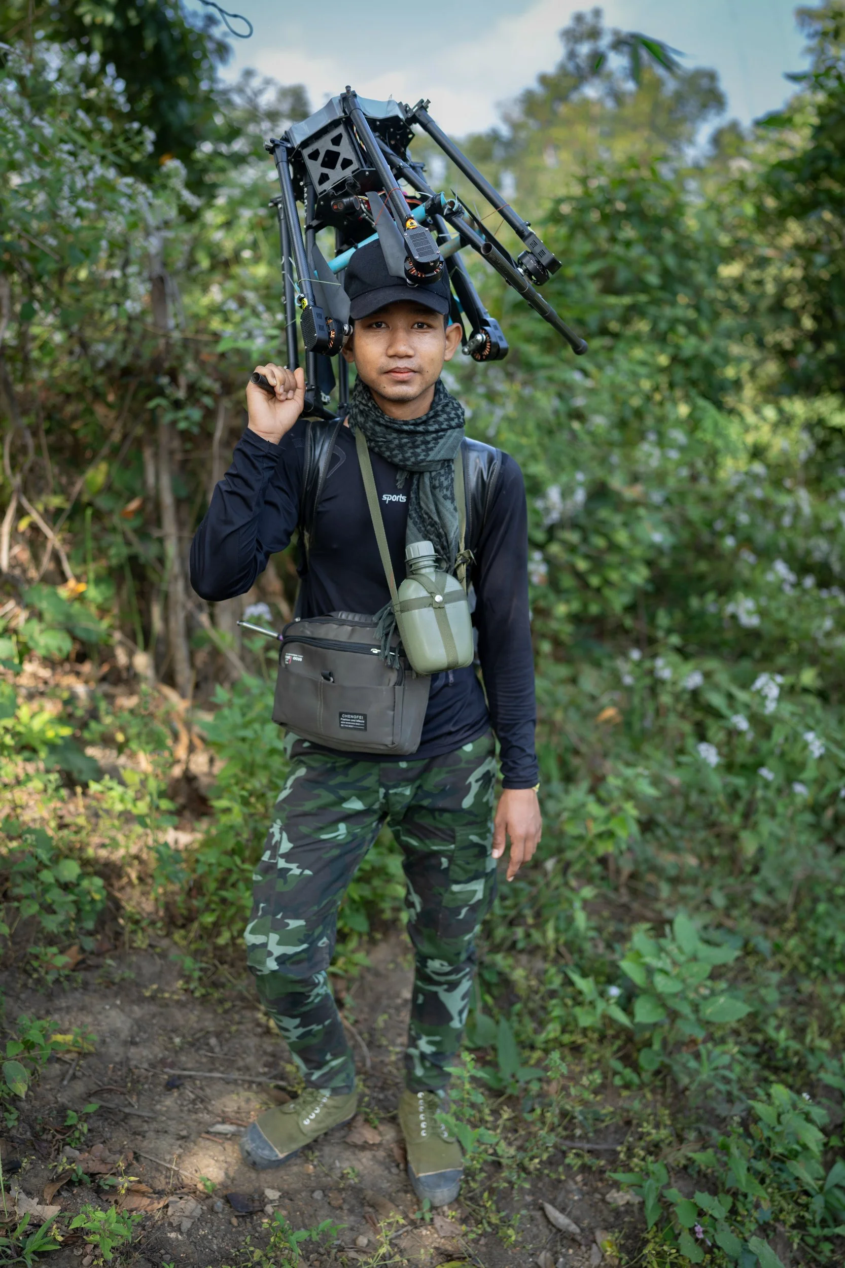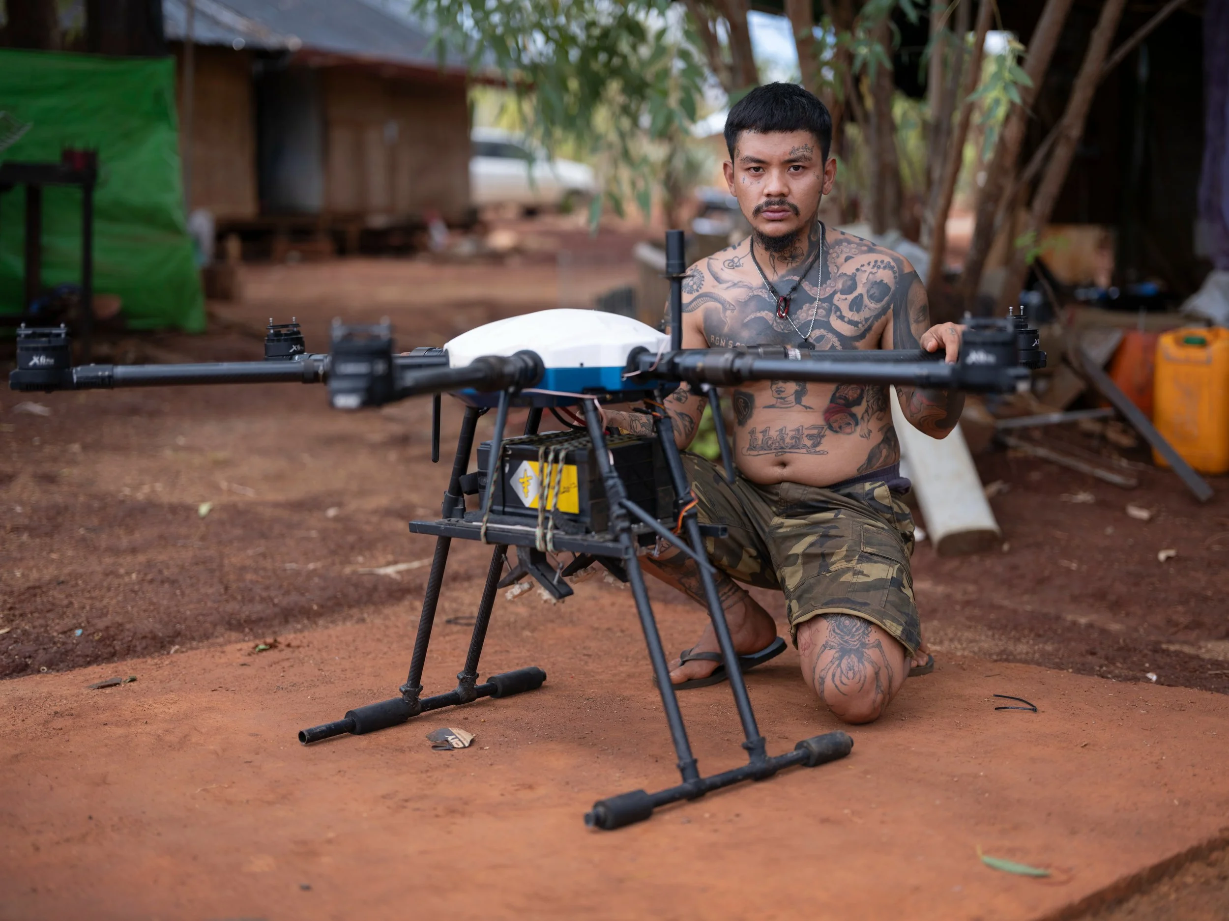 A KNDF fighter prepares a drone for deployment. Myanmar, 2025