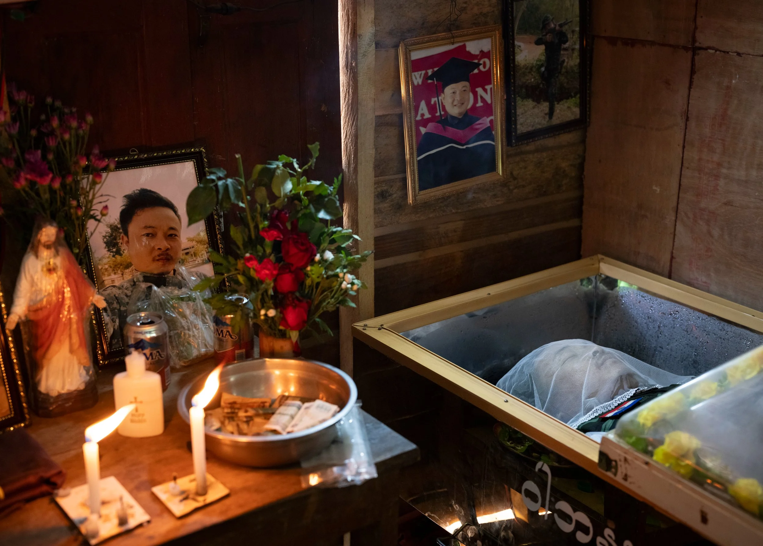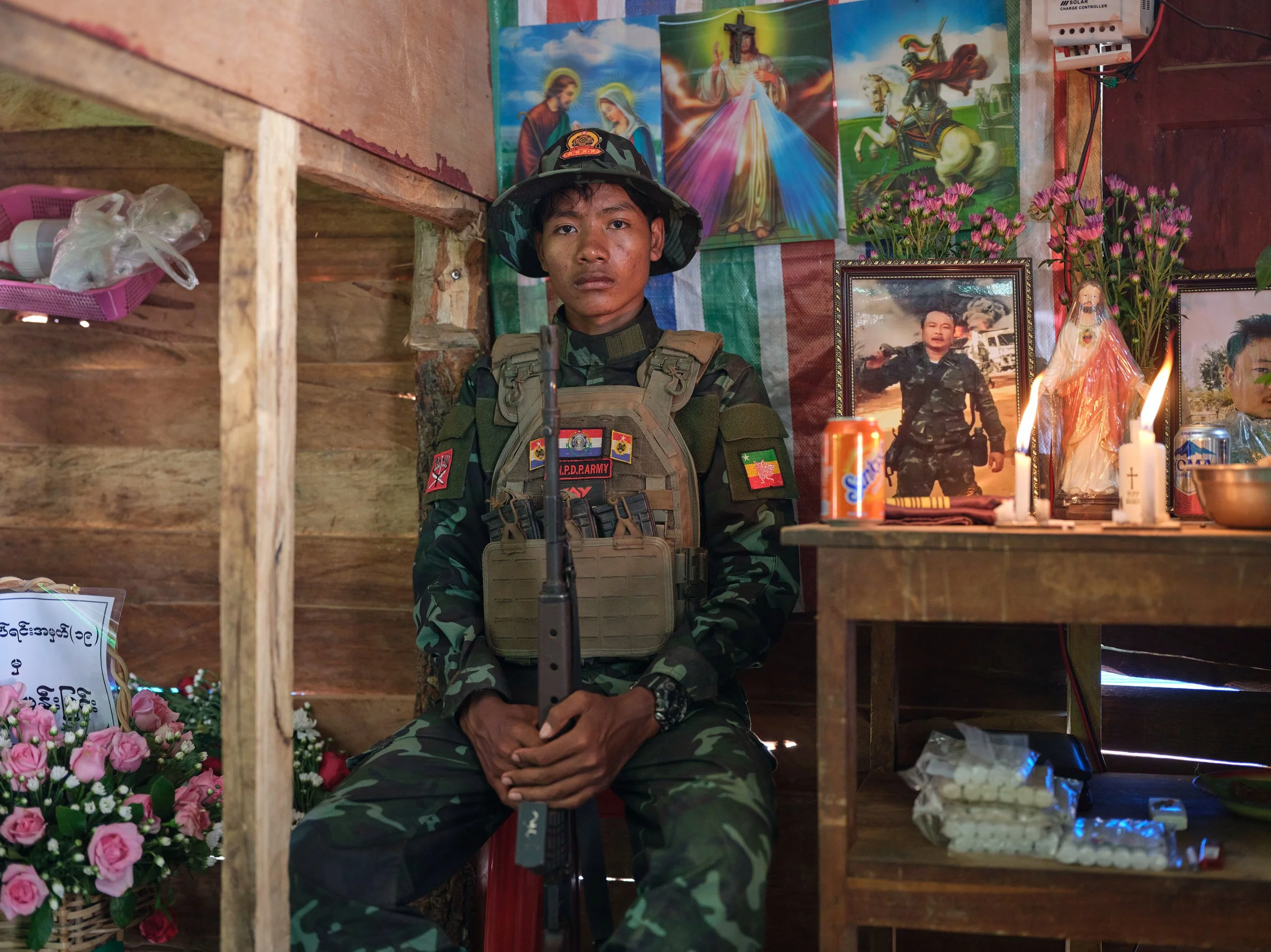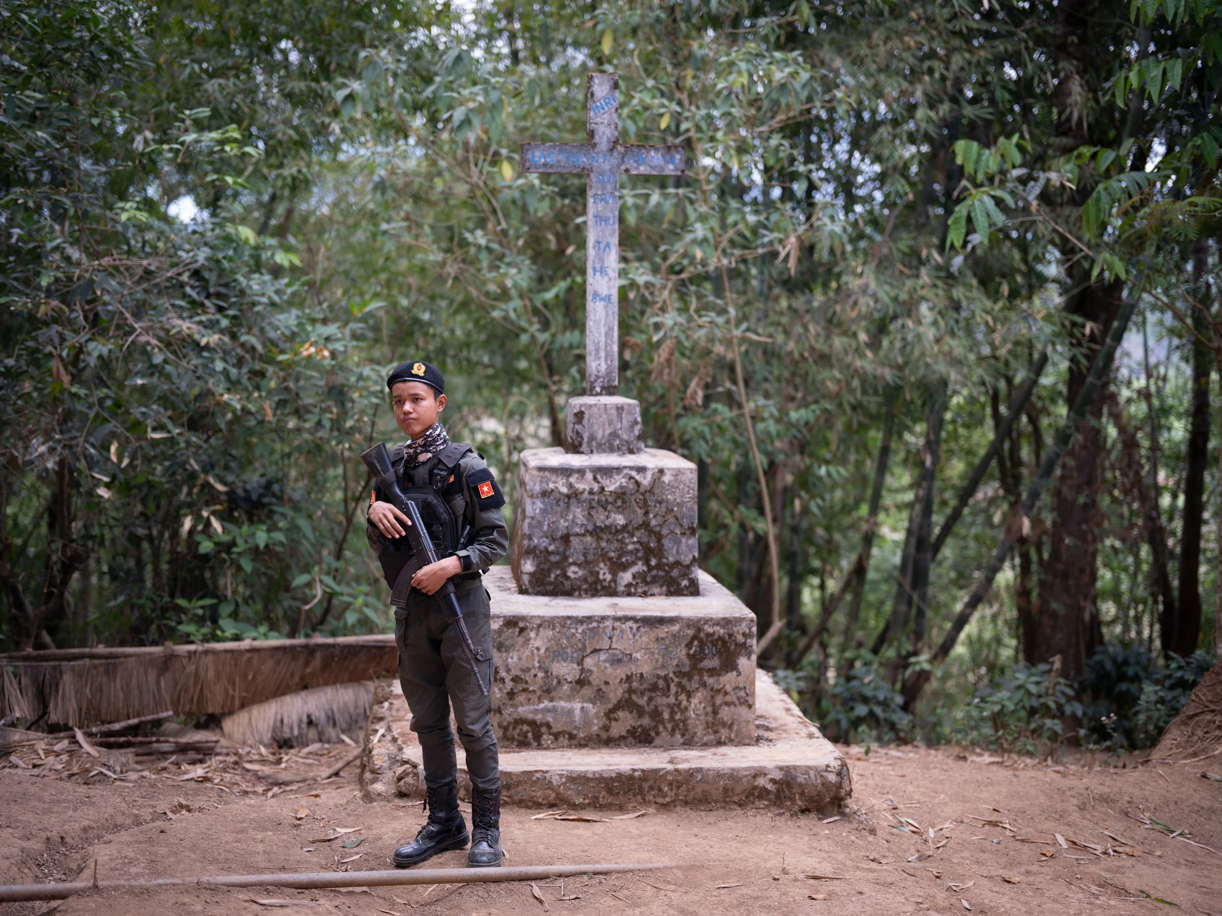 A KNPDP fighter keeps watch during the wake of his fallen comrade. Myanmar, 2025
