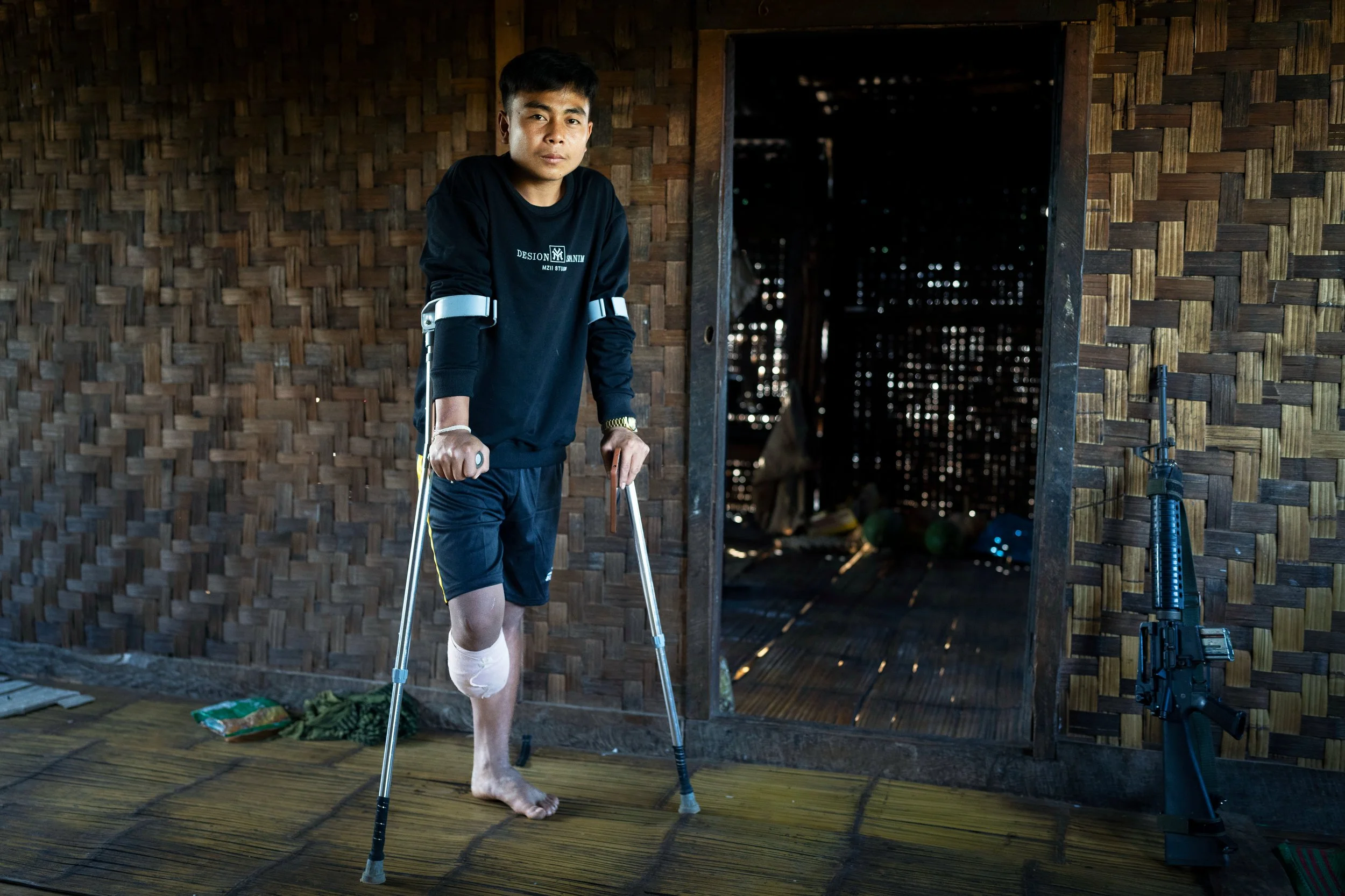 Karenni resistance fighter who stepped on a landmine while storming a junta position. Demoso, Myanmar, 2023