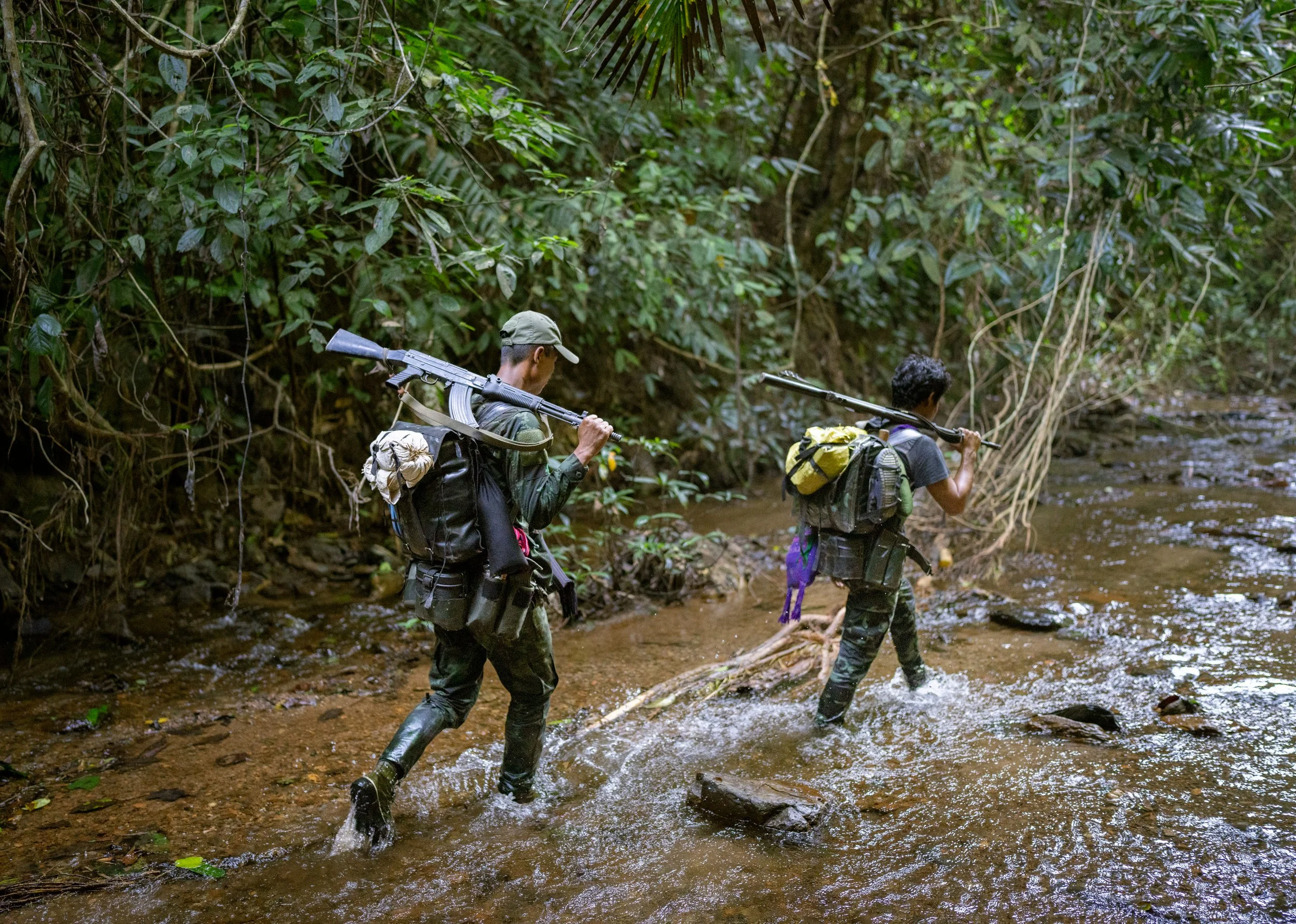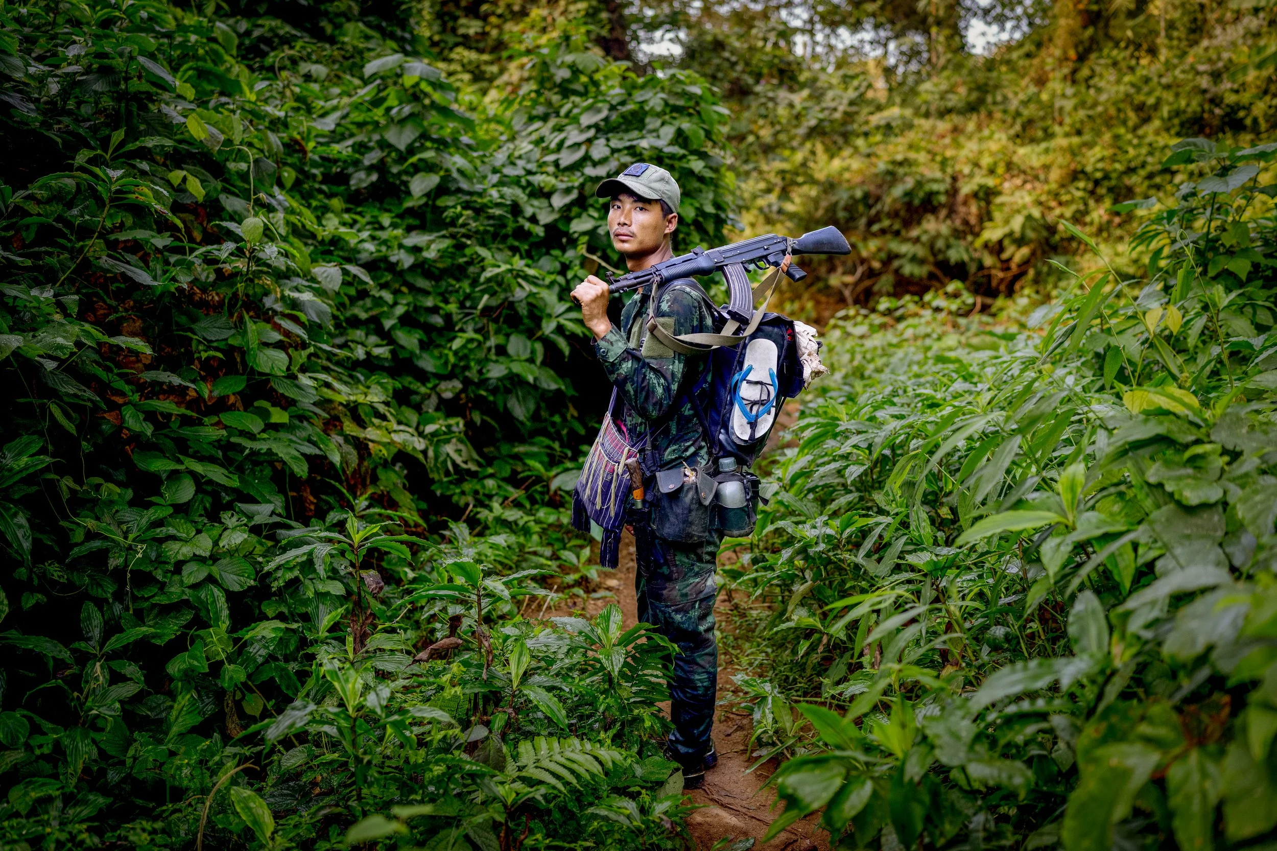 Karenni Army fighter marching towards the front. Myanmar, 2023