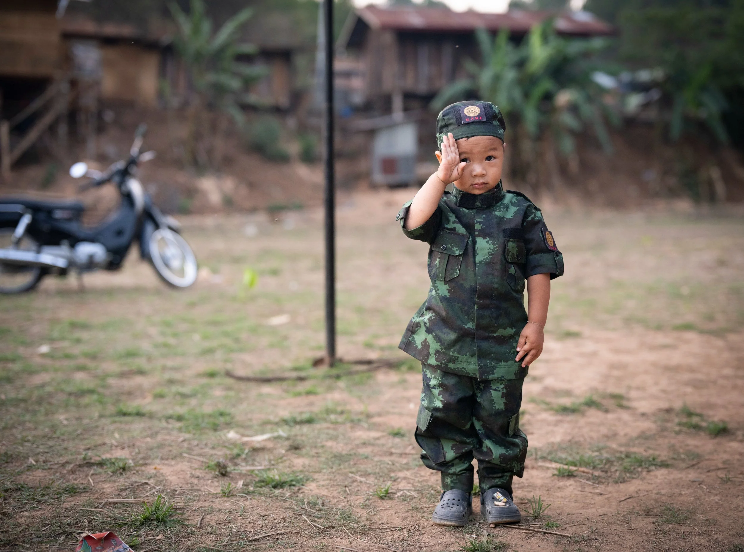 Child salutes during the wake of a fallen soldier. Myanmar, 2025