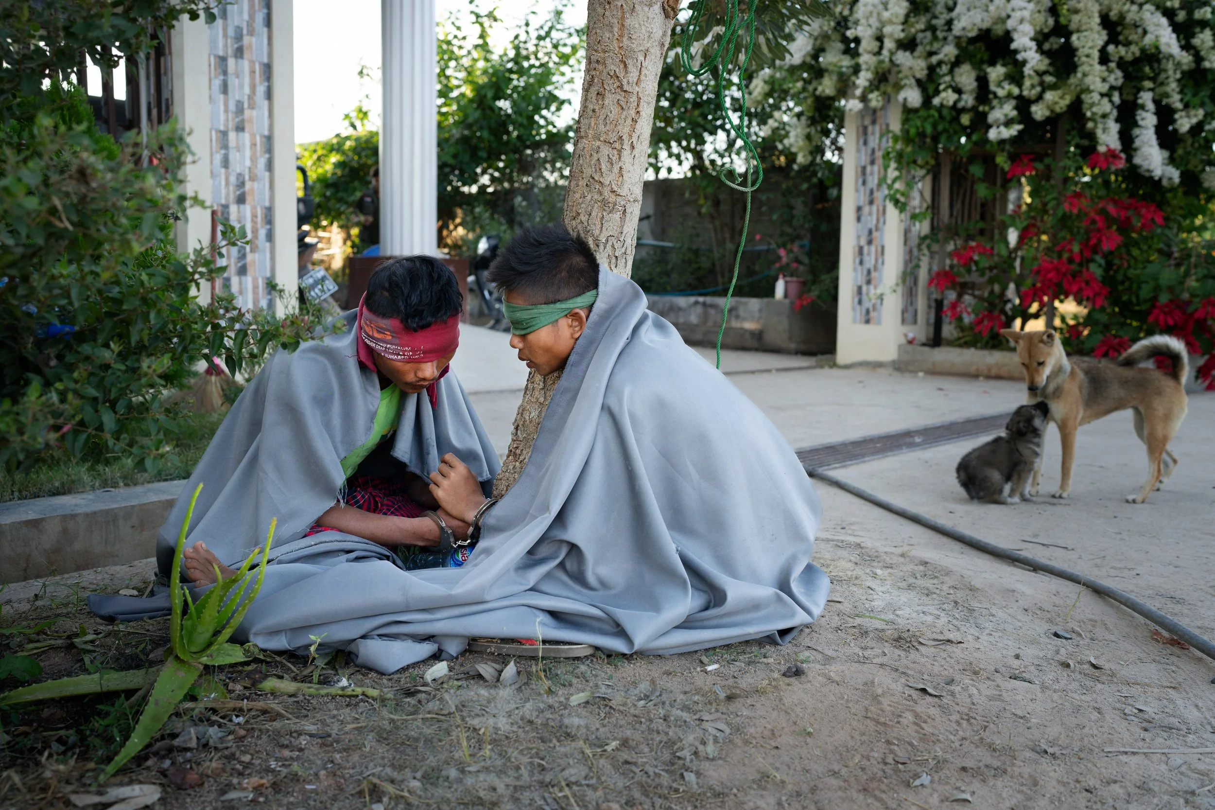 Captured government soldiers tied to a tree. Loikaw, Myanmar, 2023