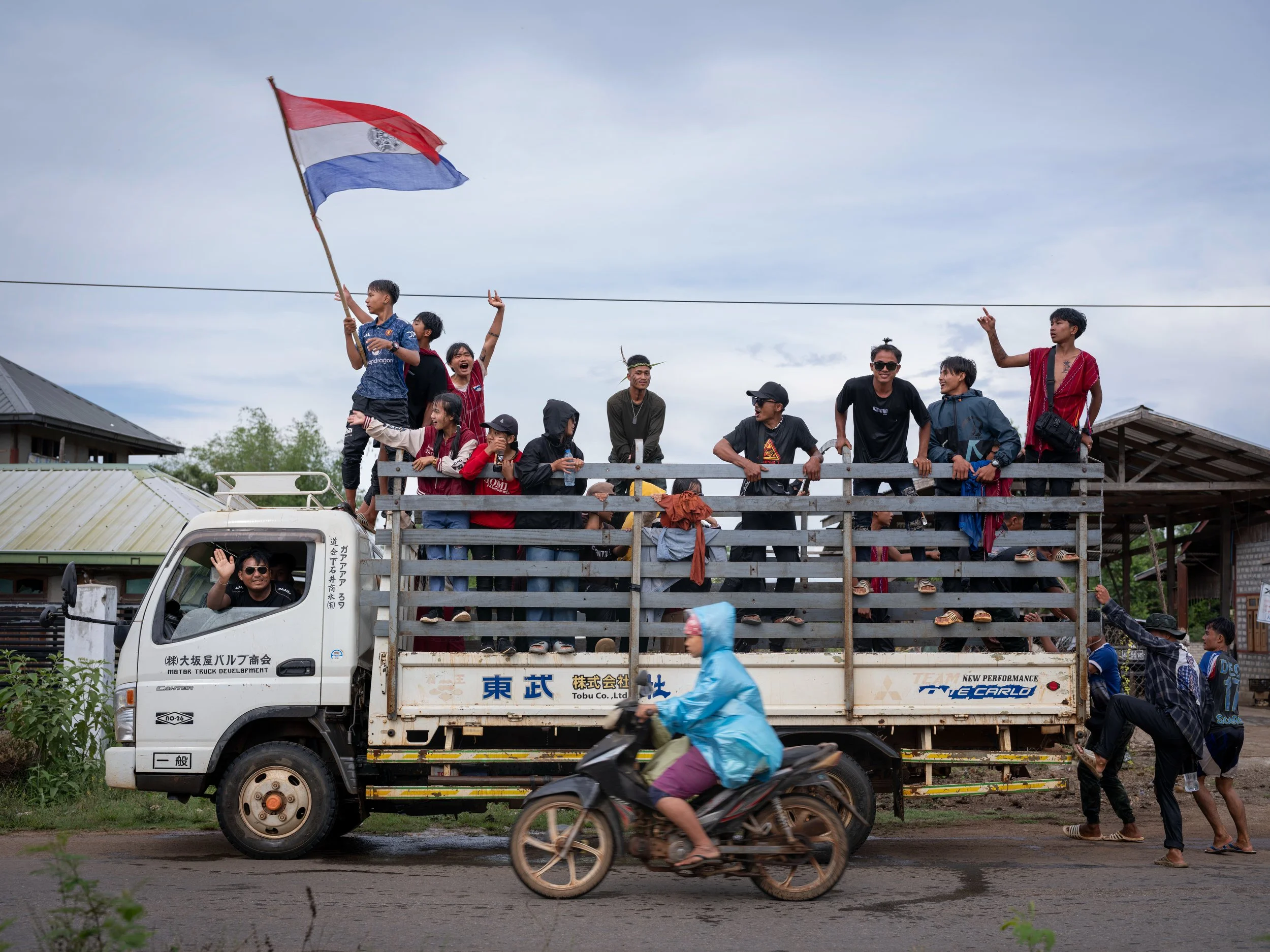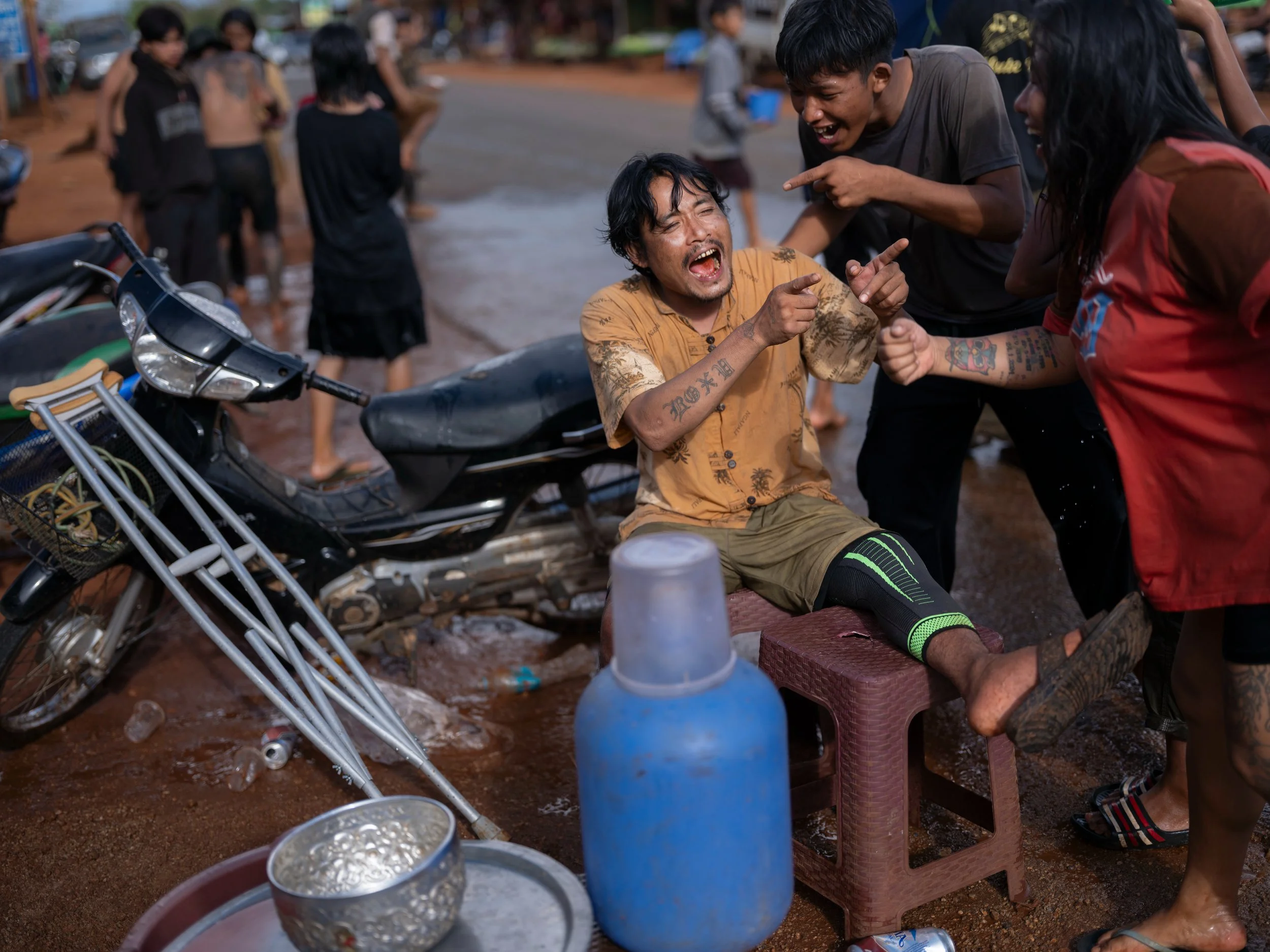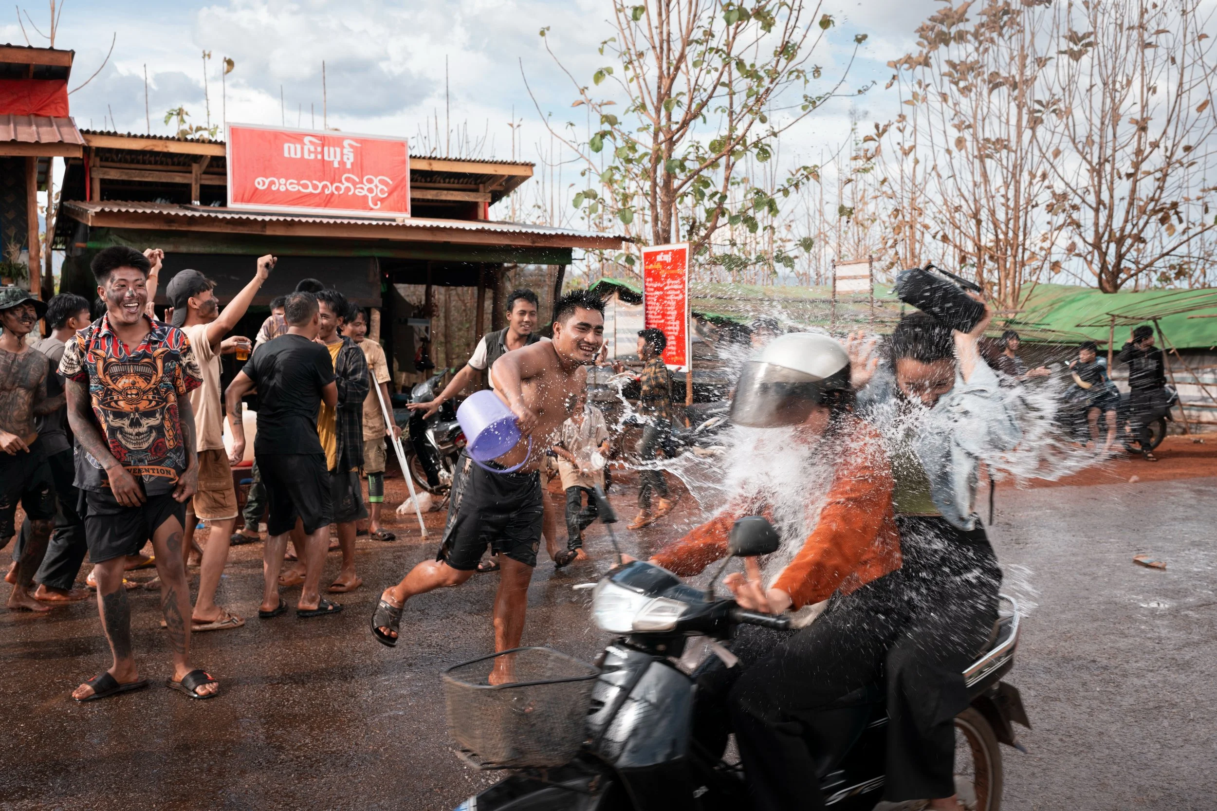Wounded PDF fighter celebrating Burmese New Year with fellow soldiers. Demoso, Myanmar, 2025