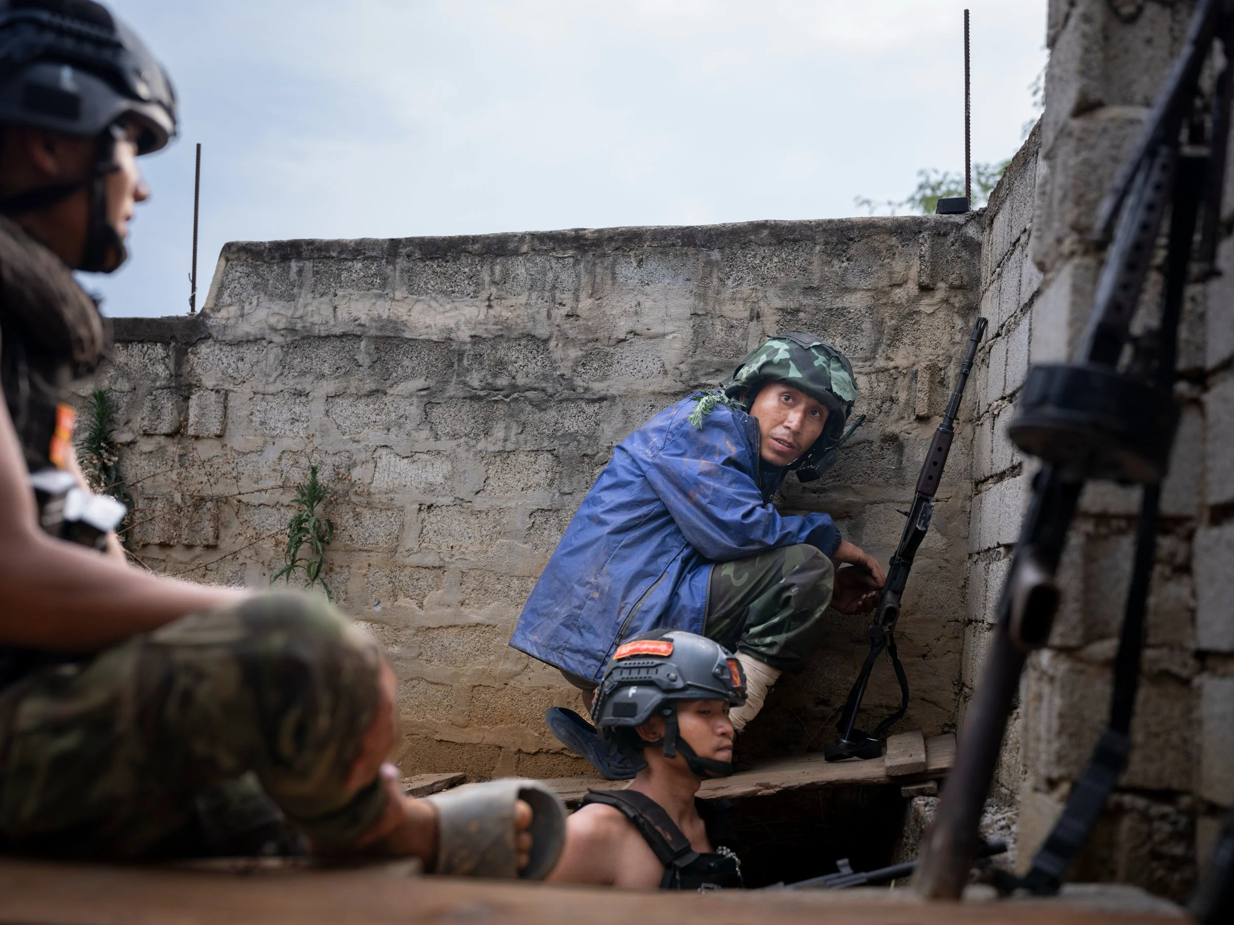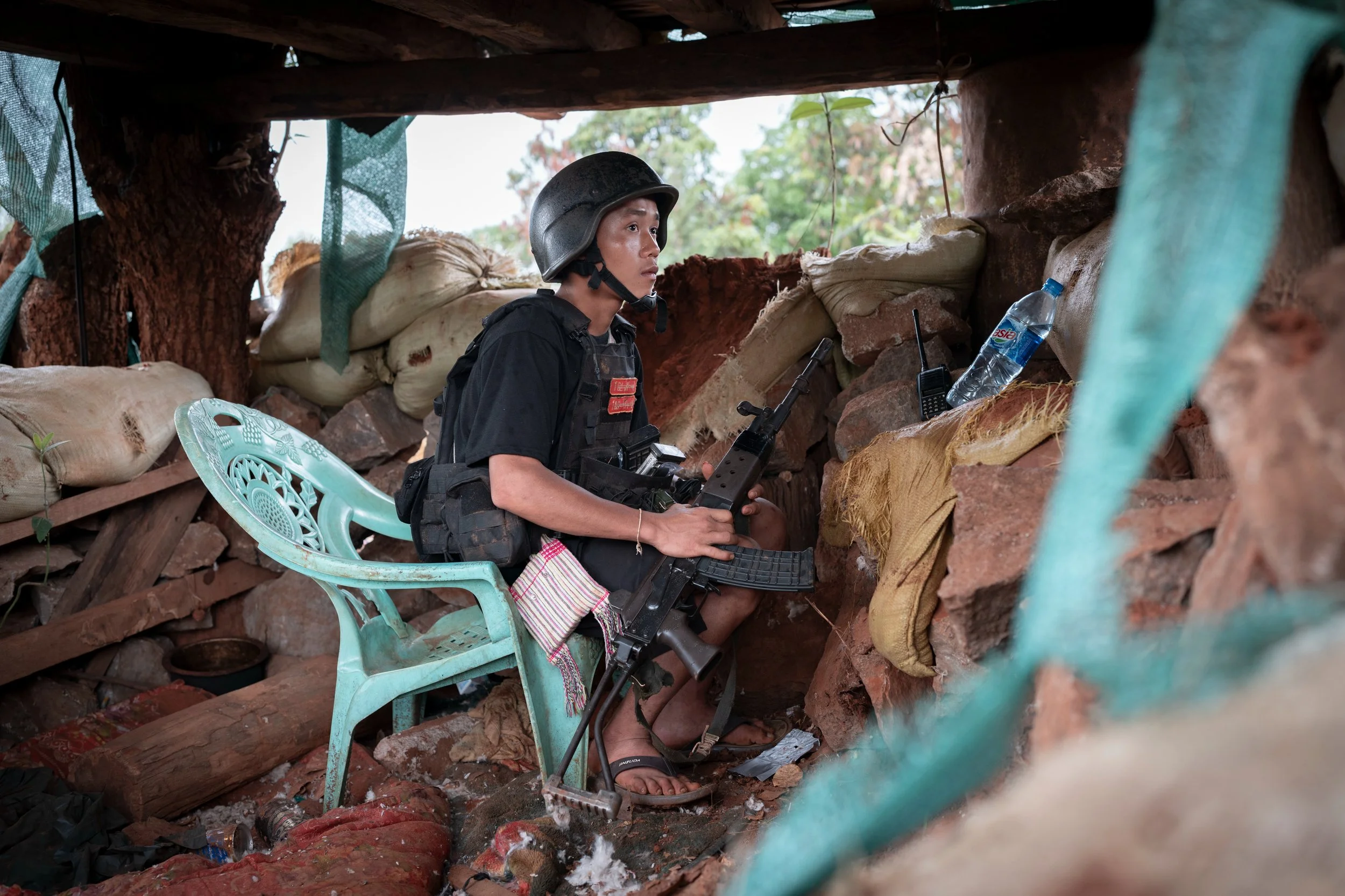 Resistance fighters sheltering for incoming artillery fire. Moebye, Myanmar, 2025