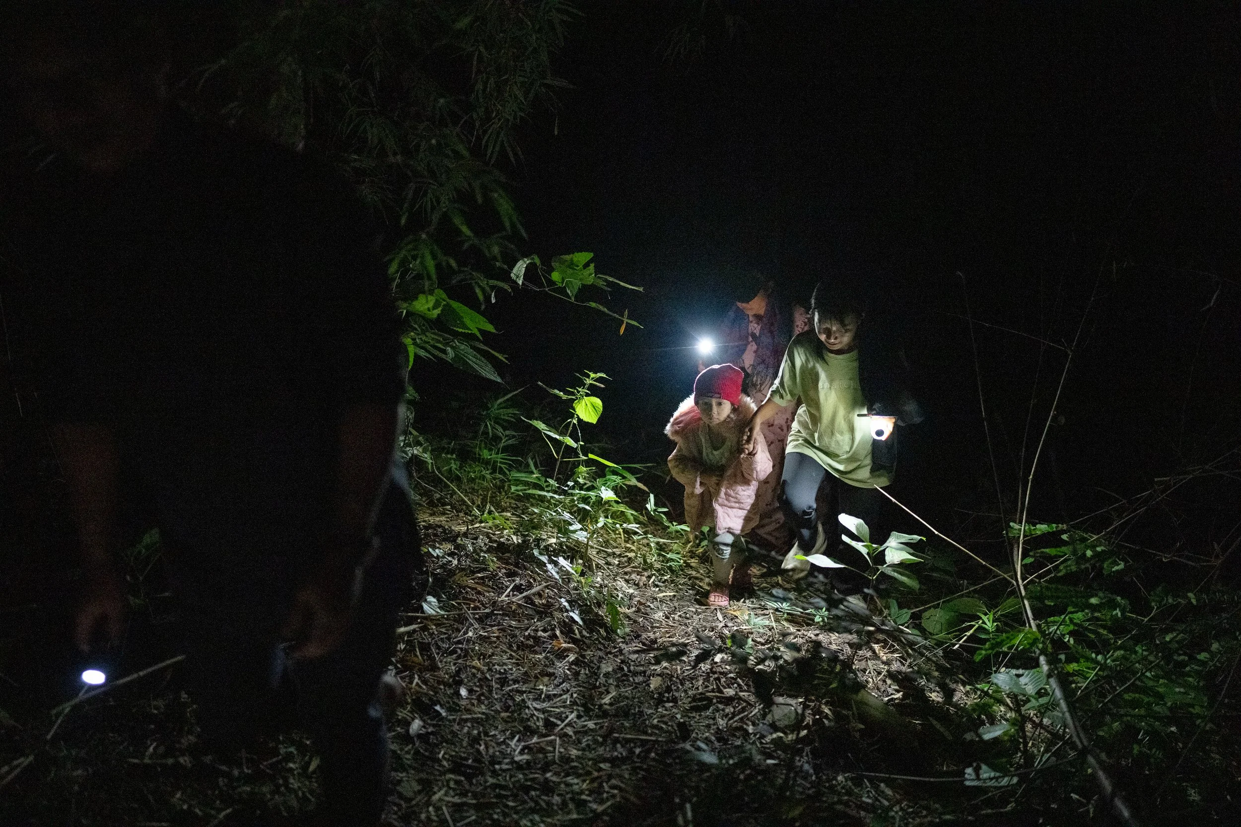 Karenni refugees crossing through the jungle into Thailand by night. Myanmar, 2023