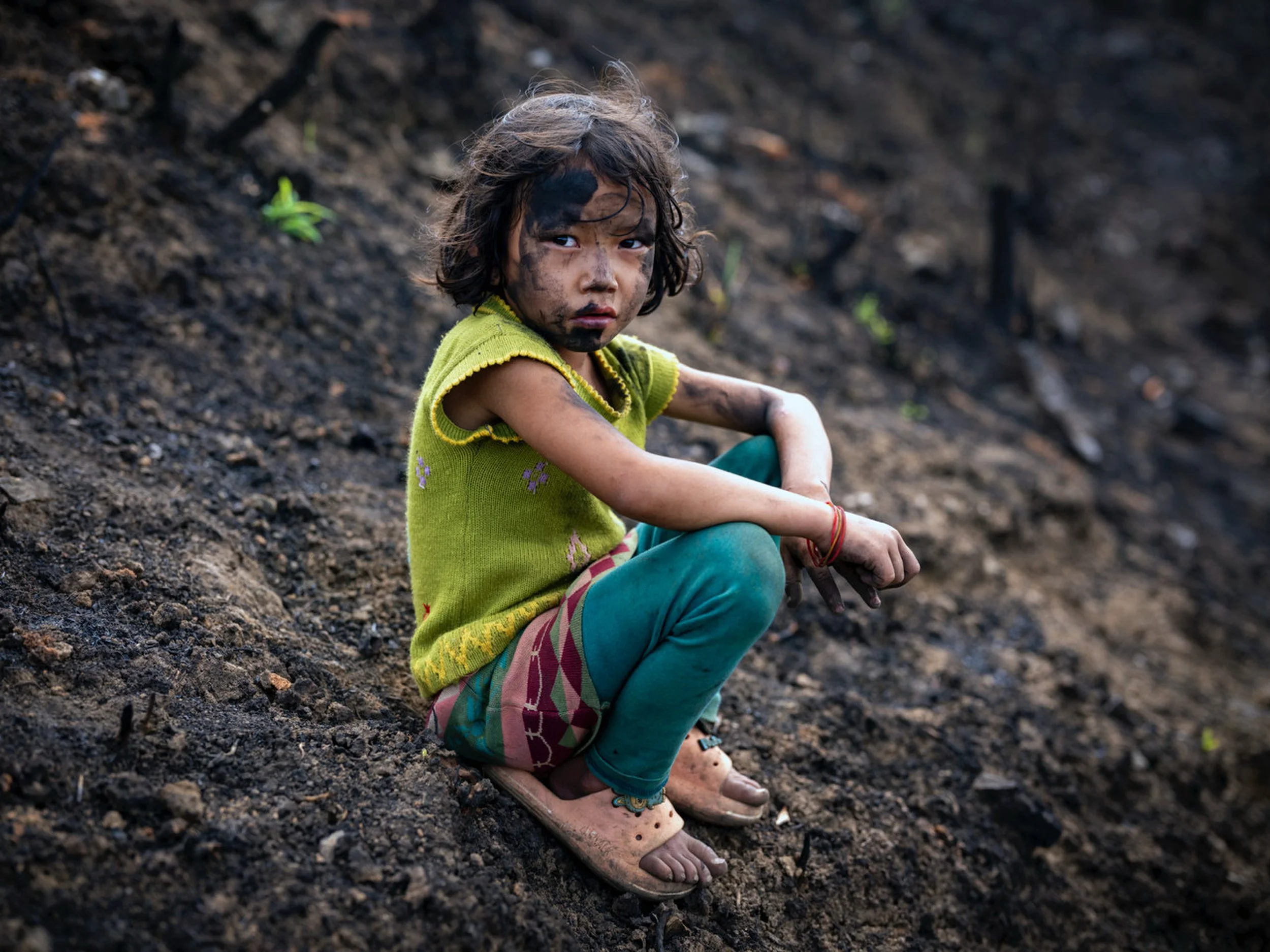 A young girl covered in coal stains sits on a hillside recently cleared through slash-and-burn. Myanmar, 2025