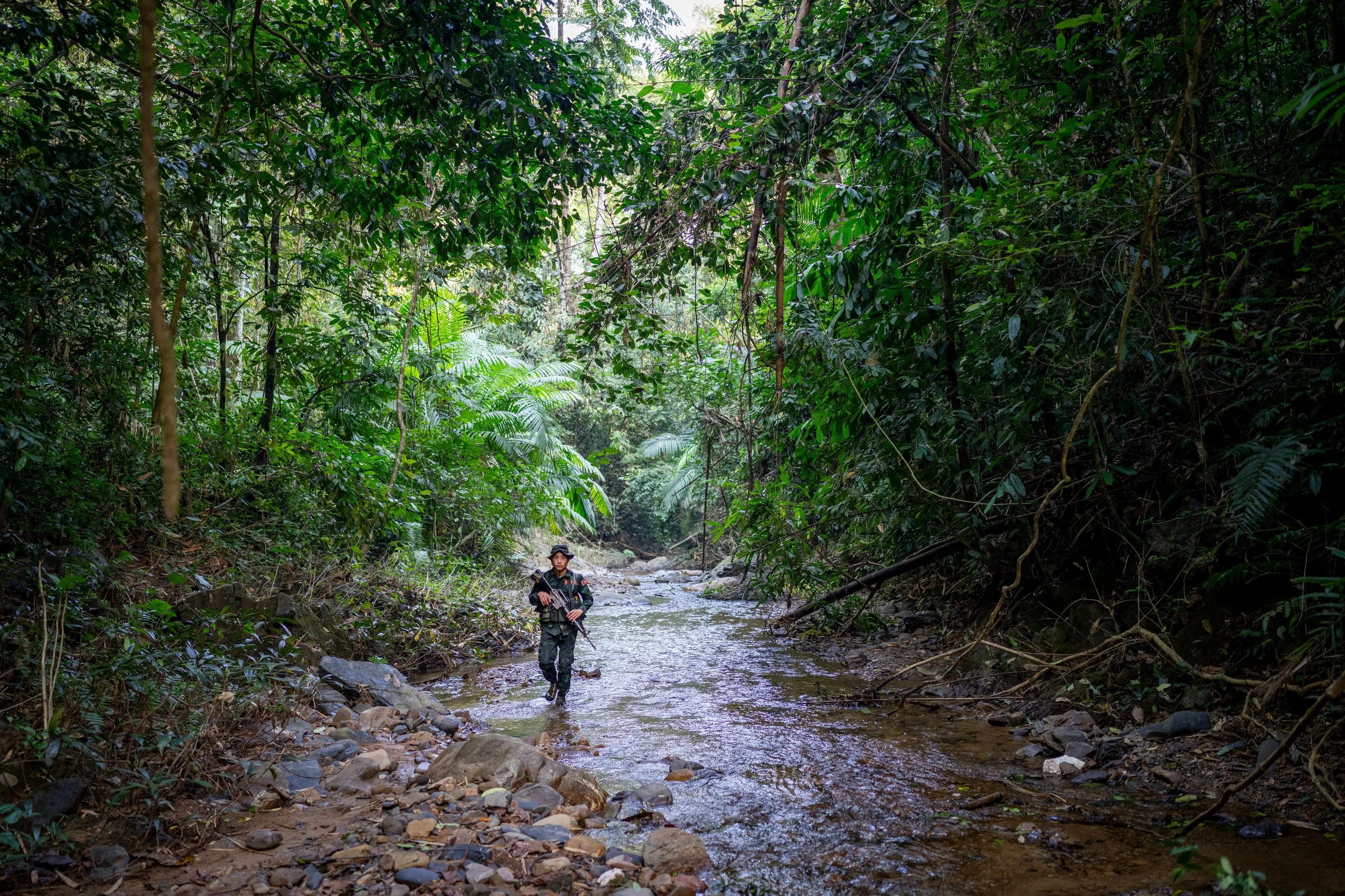 KNPLF fighter standing guard at hidden camp in the jungle. Myanmar, 2025