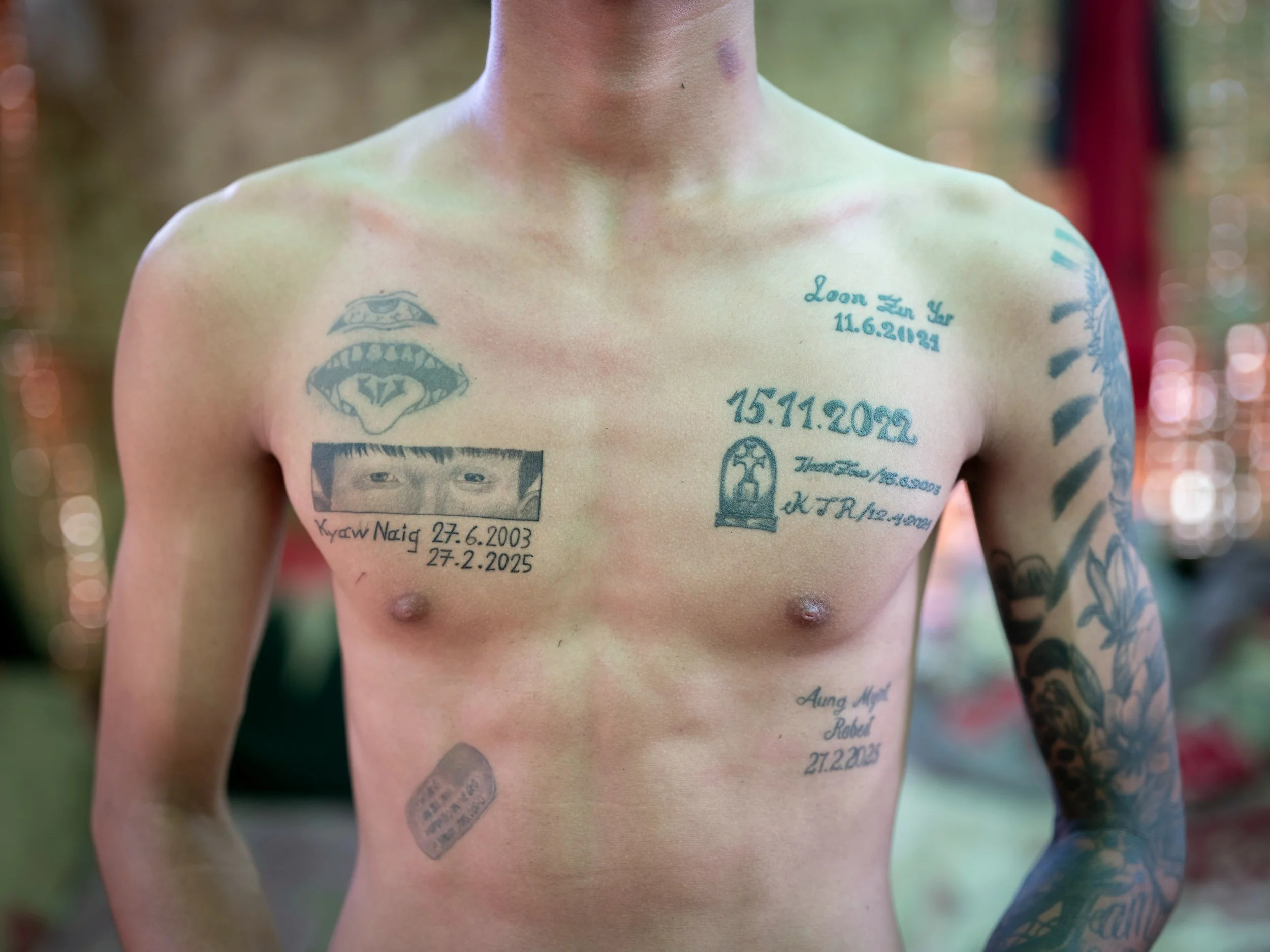 A fighter of the Urban Revolutionary Front with the names of fallen comrades tattooed on his chest. Moebye, Myanmar, 2025