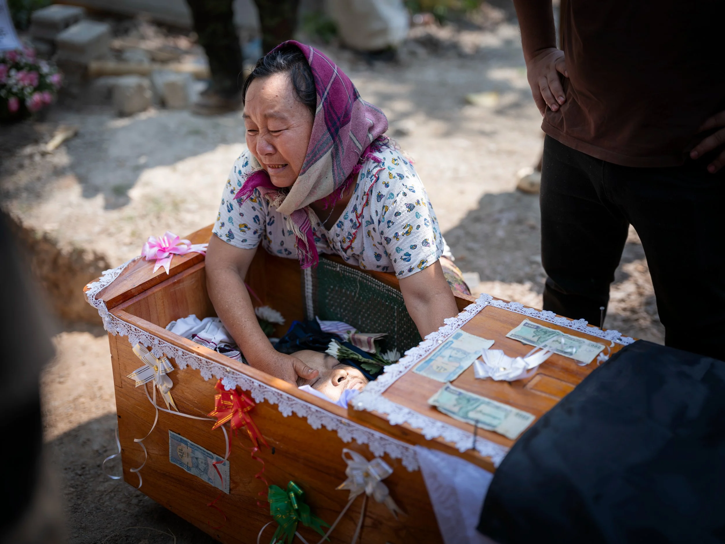A mother bids farewell to her son. The young soldier was killed by a landmine. Myanmar, 2025